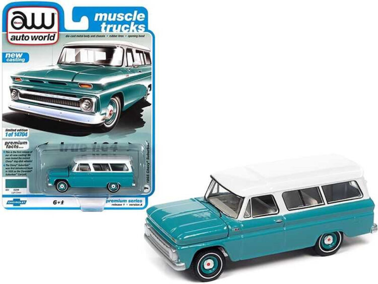 Brand : Chevrolet Model : Suburan Description : 1/64 1965 Chevrolet Suburban, light green with white roof Manufacturer : Auto