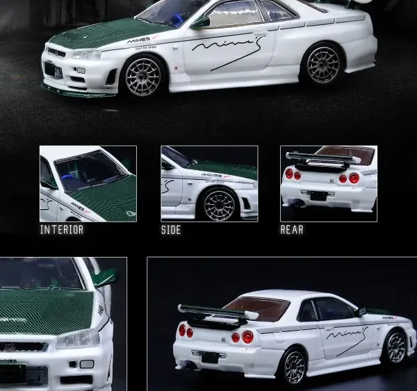 Brand : Nissan Model : Skyline GT-R Description : 1/64 Nissan Skyline GT-R (R34) Nismo R-Tune *MINES*, white with green