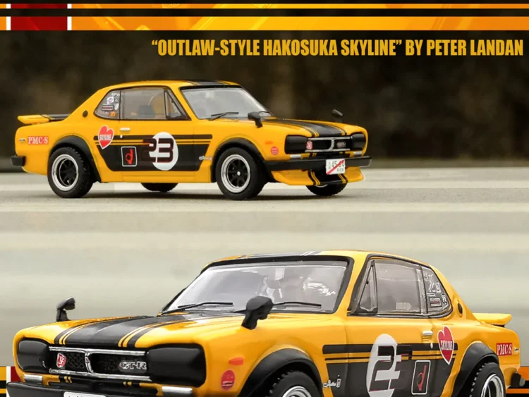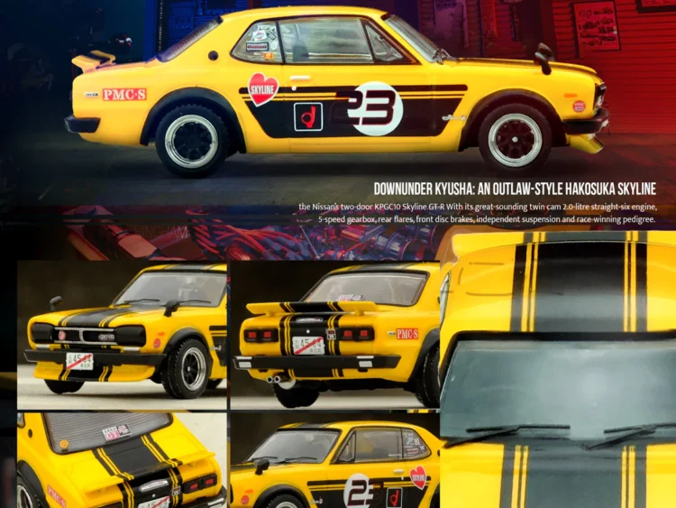 Brand : Nissan Model : Skyline GT-R Description : 1/64 Nissan Skyline 2000 GT-R (KPGC10), yellow/black Manufacturer : Inno Models