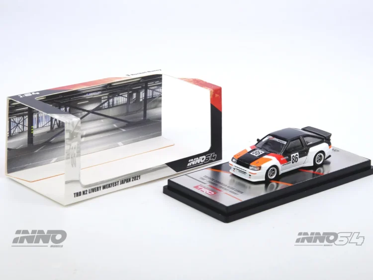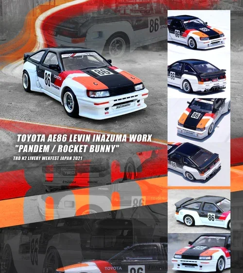 Brand : Toyota Model : Levin AE86 Description : 1/64 Toyota Levin AE86 #86 *Inazuma WORX Pandem/Rocket Bunny*, white/black/orange/red Manufacturer