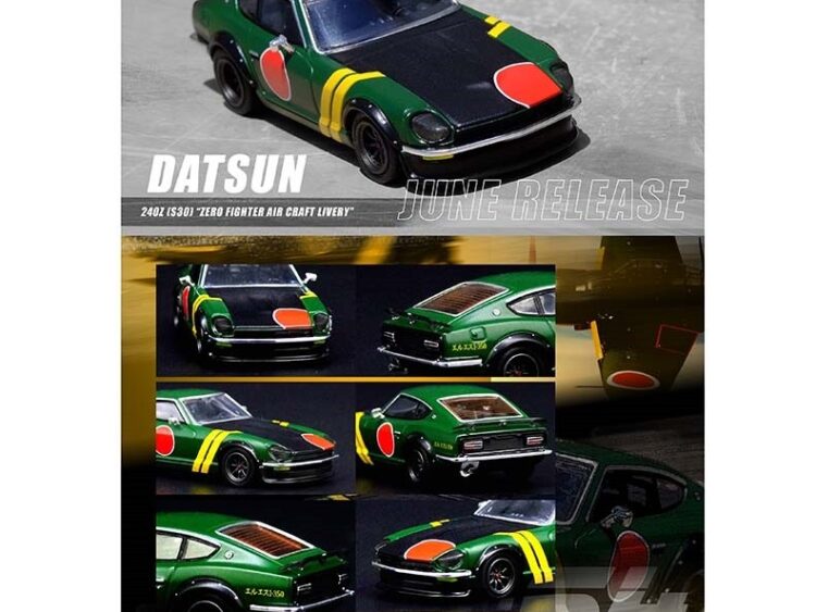 Brand : Datsun Model : 240Z Description : 1/64 Datsun 240Z Zero Fighter Aircraft Livery, green/black/red/yellow Manufacturer : Inno Models