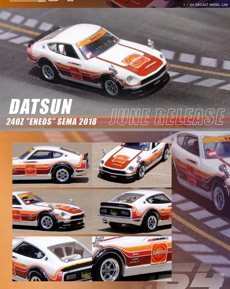 Brand : Datsun Model : 240Z Description : 1/64 Datsun 240Z *Eneos* Sema Show 2018, white/brown/yellow/red Manufacturer : Inno Models