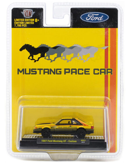 Brand : Ford Model : Mustang GT Description : 1987 Ford Mustang GT Custom, yellow Manufacturer : M2 Machines Scale