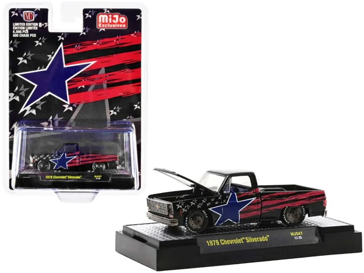 Brand : Chevrolet Model : Silverado Description : 1979 Chevrolet Silverado pick-up stars & stripes, black/red/blue Manufacturer : M2 Machines