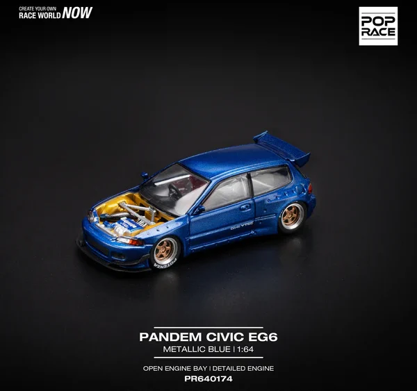 Brand : Honda Model : Civic EG6 Description : 1/64 Pandem Civic EG6, metallic blue with open hood Manufacturer :