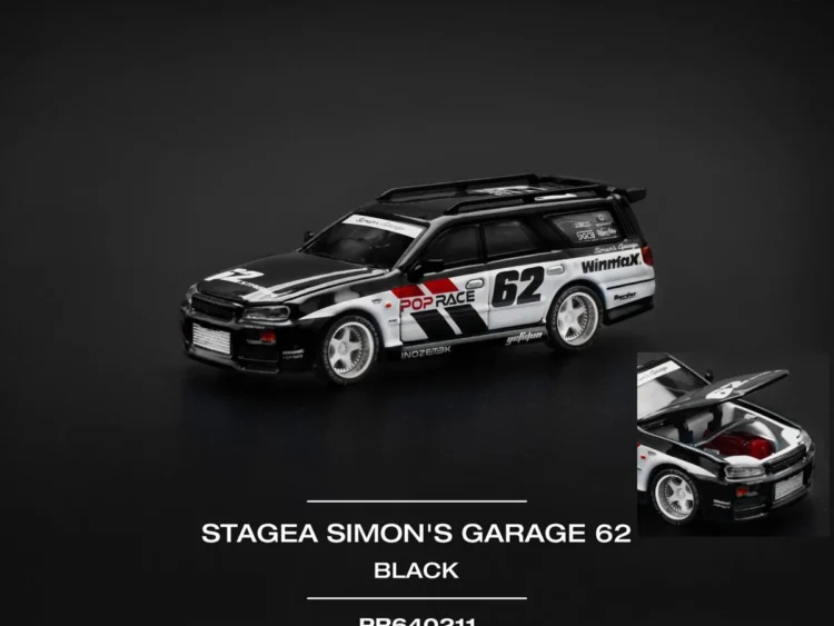 Brand : Nissan Model : Stagea Description : 1/64 Nissan Stagea Simon`s Garage #62, black Manufacturer : Pop Race Limited