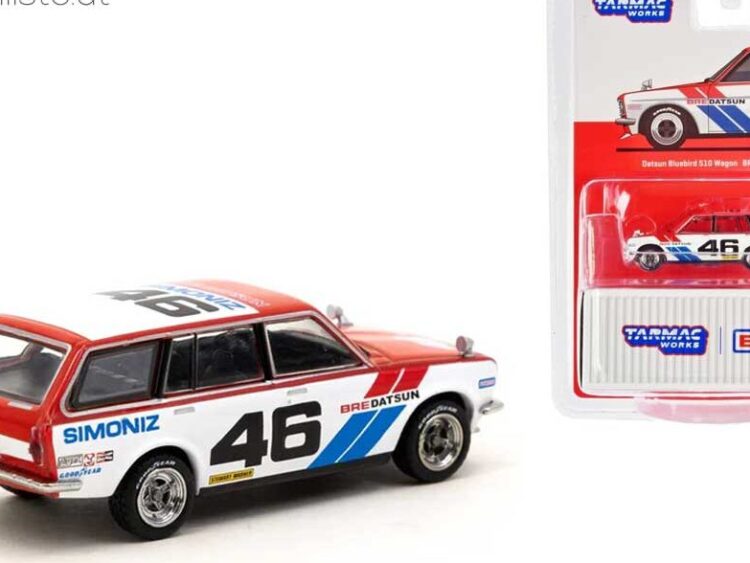 Brand : Datsun Model : Bluebird 510 Wagon #46 Description : 1/64 Datsun Bluebird 510 Wagon BRE #46, red/white/blue Manufacturer