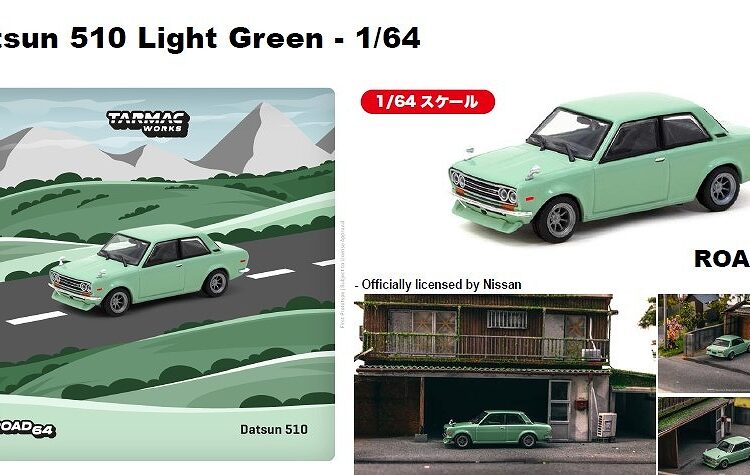 Brand : Datsun Model : 510 Description : 1/64 Datsun 510, light green Manufacturer : Tarmac Category : Street cars