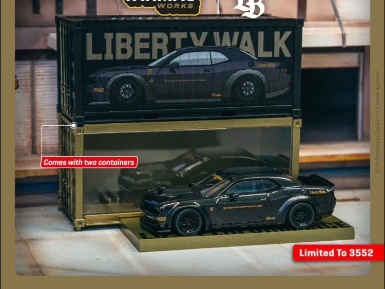 Brand : Dodge Model : Challenger Description : 1/64 Dodge Challenger SRT Hellcat *LB-WORKS* with 2 containers, black metallic Manufacturer