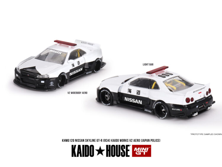 Brand : Nissan Model : Skyline GT-R Description : 1/64 1999 Nissan Skyline GT-R (R34) Kaido Works V2 Aero, white/black