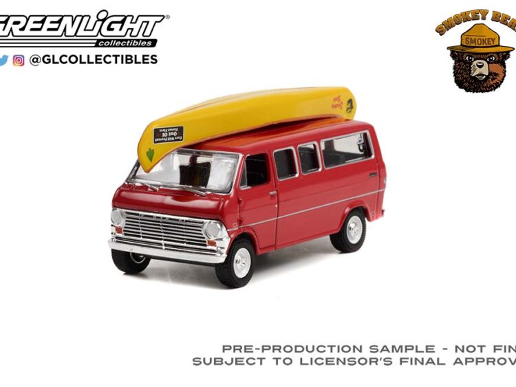 1969 Ford Club Wagon with Canoe on Roof *Care Will Prevent 9 Out Of 10 Forest Fires!* Smokey Bear Series 1, red