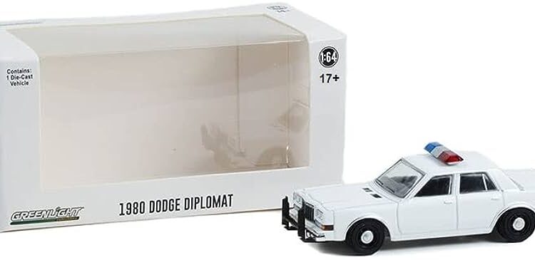 Brand : Dodge Model : Diplomat Description : 1/64 1980-1989 Dodge Diplomat *Hot Pursuit Series*, white Manufacturer : GreenLight Scale