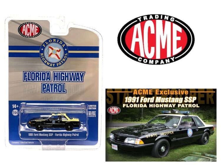 Brand: Ford Model: Mustang SSP Description: 1991 Ford Mustang SSP Florida Highway Patrol, black/white Manufacturer: Acme Diecast Category: Police &