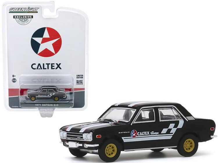 Greenlight (#30169) 1/64 Scale Caltex with Techron - 1971 Datsun 510 4-Door Sedan Features and Details: • Hobby Exclusive • Authentic Decoration • Chrome Accents • Real Rubber Tires • True-to-Scale Detail • Limited Edition
