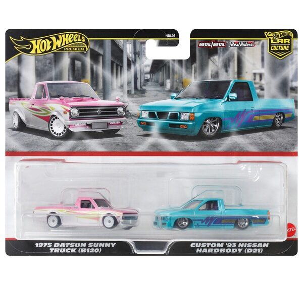 1975 Datsun Sunny Truck B120, pink/white & Custom 1993 Nissan Hardbody D21 pick-up green Premium 2-pack