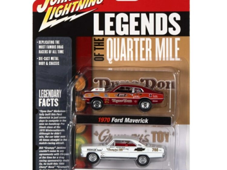Legends of the Quarter Mile 2-pack:1x “Dyno” Don Nicholson 1970 Ford Maverick, Red, Orange & White + Dyno Don Race Graphics1x Bill “Grumpy” Jenkins 1966 Chevrolet Nova, White + Bill Jenkins Grumpy’s Toy Graphics