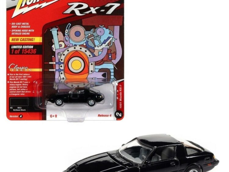 Brand : Mazda Model : RX7 Description : 1:64 1981 Mazda RX7, Brilliant Black Manufacturer : Johnny Lightning Scale :