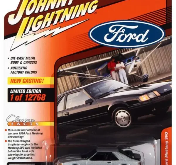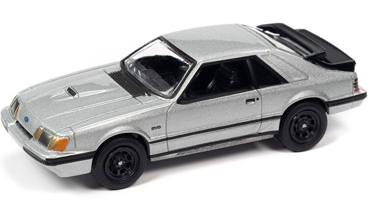 Brand : Ford Mustang Model : SVO Description : 1/64 1986 Ford Mustang SVO, silver Manufacturer : Johnny Lightning Scale