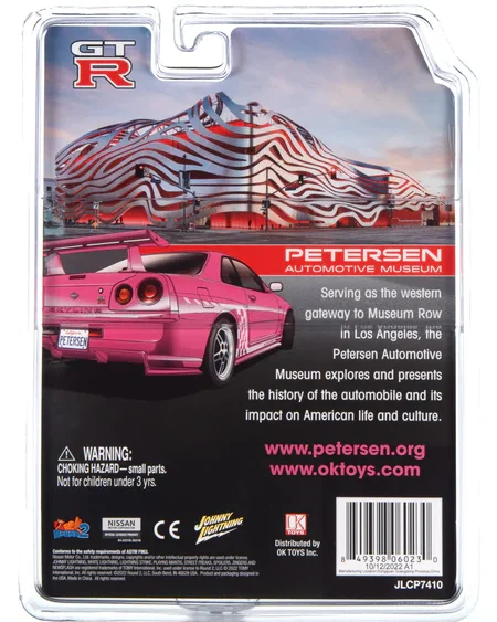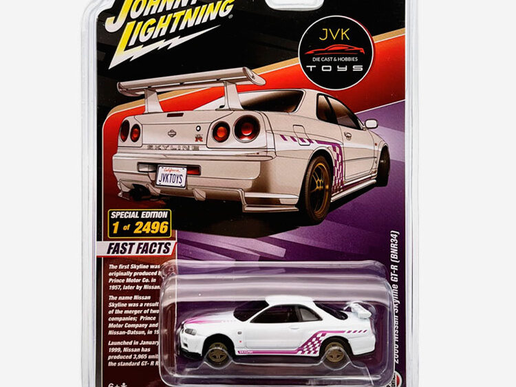 Brand: Nissan Model: Skyline GT-R BNR34 Description: 1/64 2000 Nissan Skyline GT-R BNR34, pink/white Manufacturer: Johnny Lightning Limited:2496 pieces Scale: