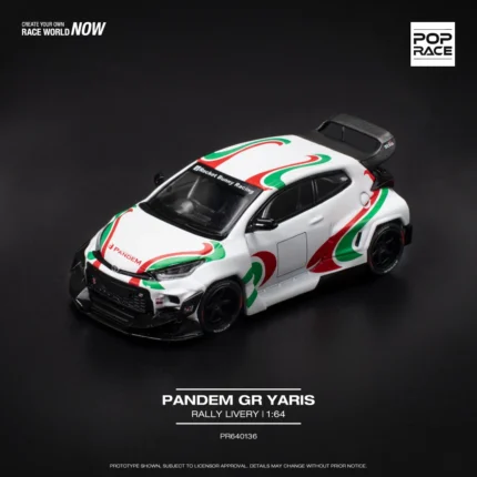 Brand : Toyota Model : Pandem GR Yaris Description : 1/64 Pandem GR Yaris, Rally Livery, white/green/red Manufacturer : Pop