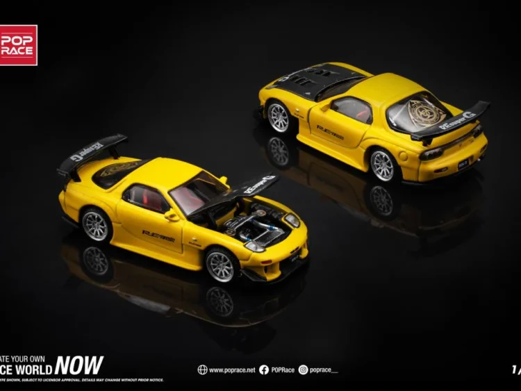 Brand : Mazda Model : RX-7 Description : 1/64 Mazda RX-7 (FD3S) Re-Amemiya Widebody, yellow Manufacturer : Pop Race Limited