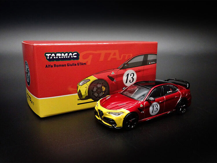 Brand : Alfa Romeo Model : Giulia GTAm Description : 1/64 Alfa Romeo Giulia GTAm, red/yellow Manufacturer : Tarmac Scale