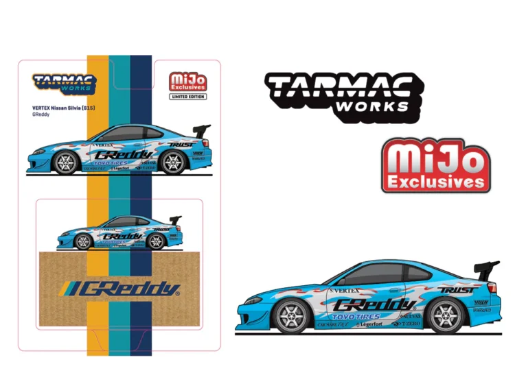 Brand : Nissan Model : Silvia (S15) Description : 1/64 Vertex Nissan Silvia S15 *GReddy*, blue Manufacturer : Tarmac Category