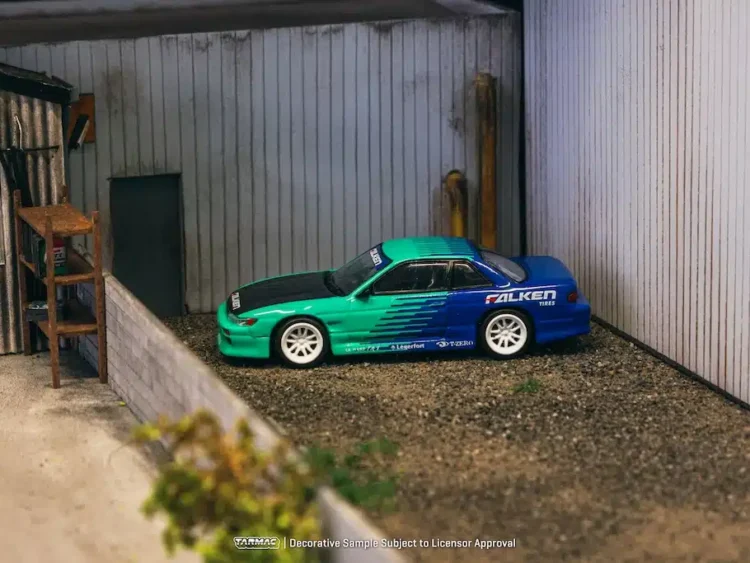 Brand : Nissan Model : Silvia Description : 1/64 Vertex Nissan Silvia S13 *Falken*, green/blue Manufacturer : Tarmac Category :