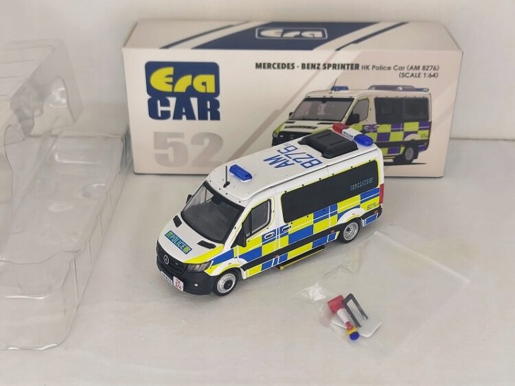 Brand : Mercedes Benz Model : Sprinter Description : 1/64 #52 2021 Mercedes Benz Sprinter HK Police Car (AM 8276),