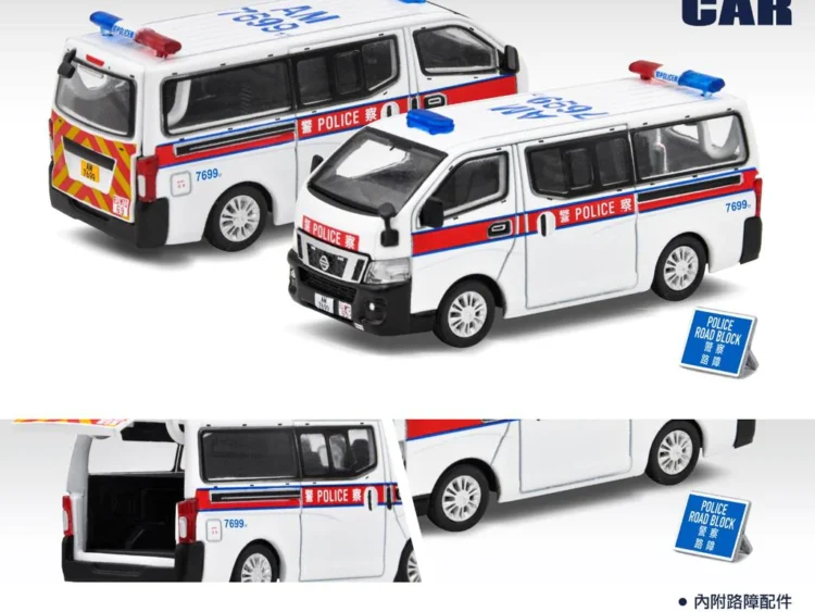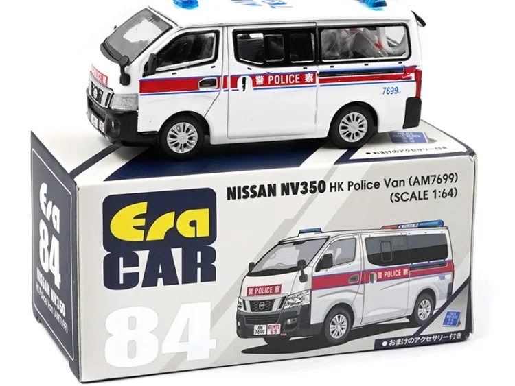 Brand : Nissan Model : NV350 Description : 1/64 Nissan NV350 Hong Kong Police van (AM7699), white/red Manufacturer : Era