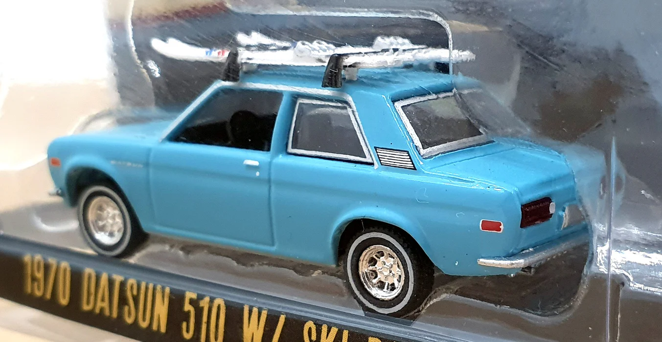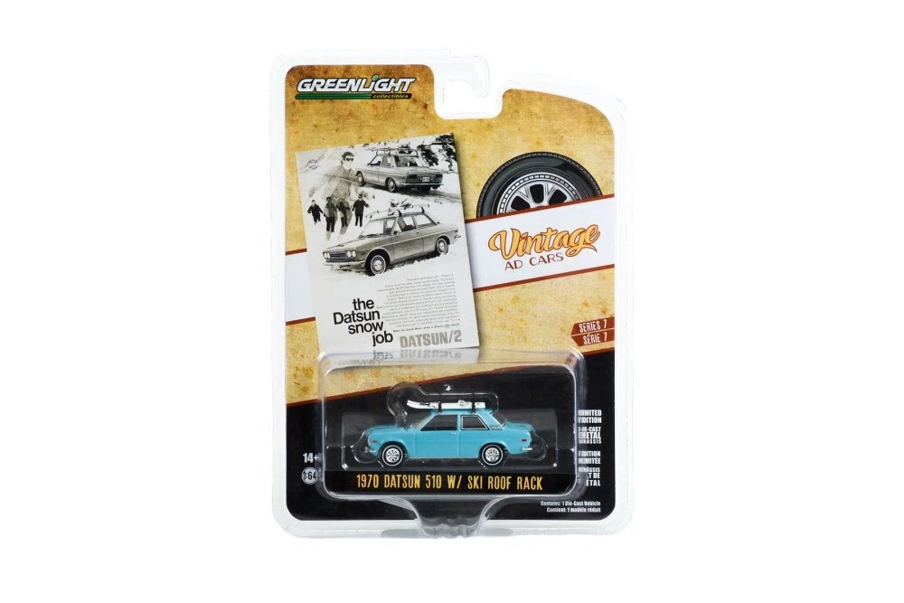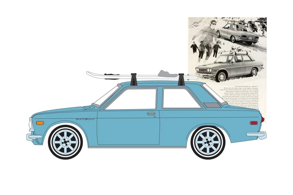 1/64 1970 Datsun 510 with Ski Roof Rack *The Datsun Snow Job* Vintage Ad Cars Series 7, blue