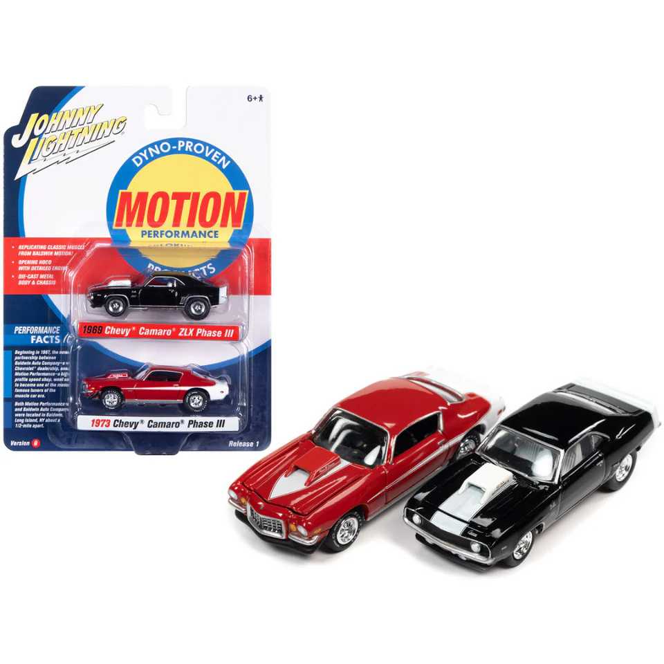 Baldwin Motion 2-pack:1x 1969 Chevrolet Camaro ZLX, Black with White Hood Stripe & Rear Stripe 1x 1973 Chevrolet Camaro Phase III, Medium Red with Hood, Side & Rear Stripes