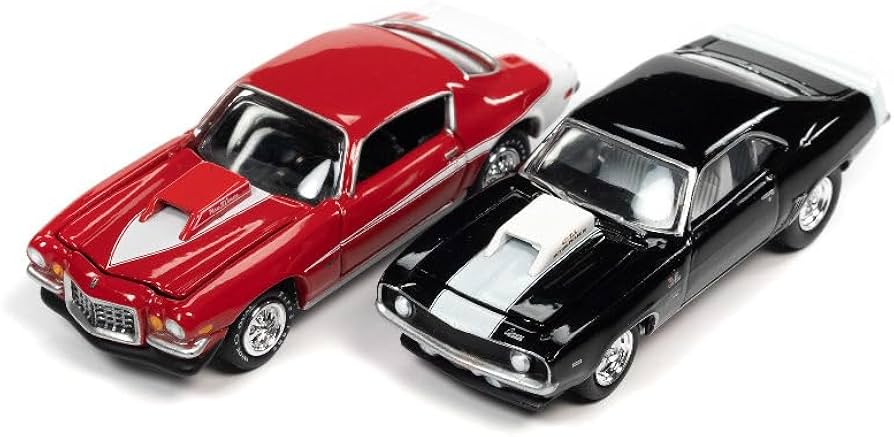 1/64 (JLPK017) Baldwin Motion 2-pack:1x 1969 Chevrolet Camaro ZLX, Black with White Hood Stripe & Rear Stripe 1x 1973 Chevrolet Camaro Phase III, Medium Red with Hood, Side & Rear Stripes