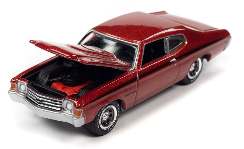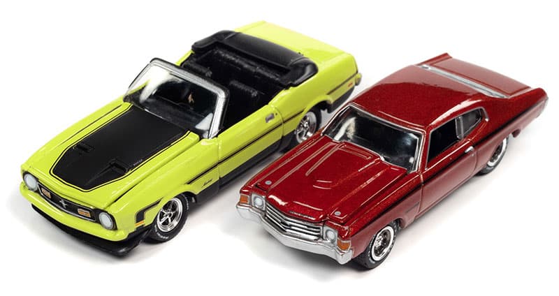 Class of 1972 2-pack:1x 1972 Ford Mustang Convertible, Bright Lime with Flat Black Hood & Side Stripes 1x 1972 Chevrolet Chevelle SS Heavy Chevrolet, Orange Flame with Heavy Chevy Emblem & Black Side Stripe