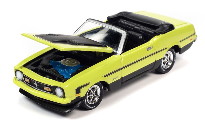 1/64 (JLPK017) Class of 1972 2-pack:1x 1972 Ford Mustang Convertible, Bright Lime with Flat Black Hood & Side Stripes 1x 1972 Chevrolet Chevelle SS Heavy Chevrolet, Orange Flame with Heavy Chevy Emblem & Black Side Stripe